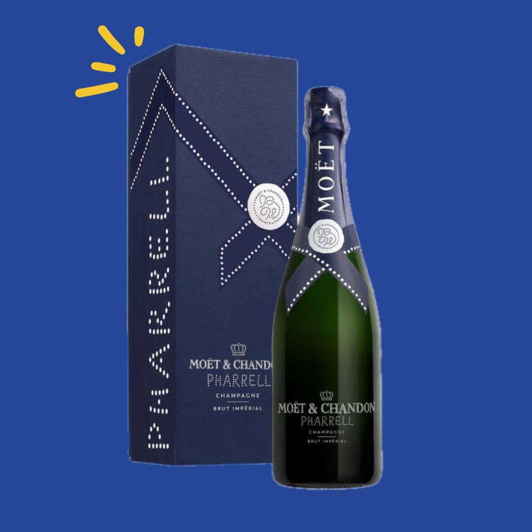 Un champagne emblématique de la Maison Moët & Chandon revisité par Pharrell Williams, arborant un habillage bleu vibrant inspiré de la culture marine pour une touche artistique et contemporaine.
